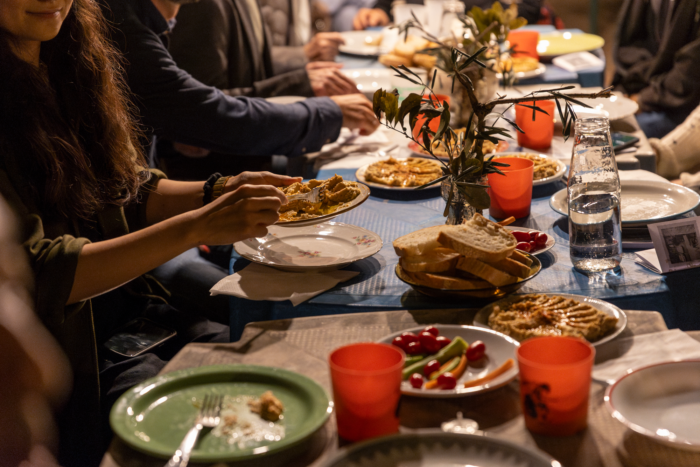 Making the food for the project’s reception was something that interested me, and when I work with Iraqi Jewish cuisine, or Iraqi cuisine in general, it is about making present those generations that have come before me and have disappeared, a part of wishing for them to come back. When you remember someone they’re alive again in a way. In the Jewish religion, when somebody passes away we say “May their memory be for a blessing.” It’s not just about blessing the memory, it’s also about remembering them through deeds and acts, so in your life you do things that they might do. That involves thinking about this incredible person that Wael was and who he continues to be. To do things like making hummus with peanut butter, this comes from some of Wael’s recipes that Emily shares through Material for a film. In the 60s, when it wasn’t easy to get tahini in Rome, he had to substitute it. That aspect for me was one of the ways to think about the idea of the supper, to think about what it means to gather at a time like this, in the midst of genocide. It’s important for me to be with Emily. We were together in January here in Rome, as well with our students, and there’s nobody who I would want to be with more, at this time of the year.
