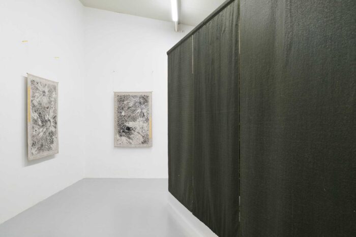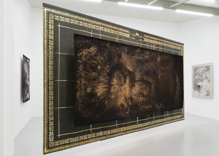 On December 12, 2025, Permanently Shadowed, a solo exhibition by Emilia Estrada, opened at Cantadora Gallery, a newly founded space for contemporary art in Rome. Living and working in Rio de Janeiro, Estrada presents a large-scale installation that interrogates the genealogy of the image as an instrument of power. At its core, a five-by-two-meter work combines charcoal on cotton with a green nylon grid framed in gold leaf, overlaying two nineteenth-century visual paradigms: the subterranean views of Jerusalem produced by the Scottish artist William Simpson (1823–1899) during British expeditions in Palestine, and the staged lunar illustrations devised by James Nasmyth for his book The Moon: Considered as a Planet, a World, and a Satellite (1874).