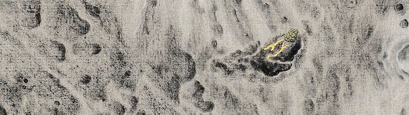 By bringing these coeval images into dialogue, Estrada reveals a shared imperial logic in which scientific inquiry, visual representation, and territorial ambition converged. Archaeology and astronomy emerge as parallel technologies of illumination, transforming both Jerusalem’s underground and the Moon’s surface into spaces to be measured, mapped, and eventually conquered. Through subtle reversals, editorial shifts, and material interventions, the artist exposes the staged nature of supposedly objective images, unsettling their claims to truth. Charcoal maps of lunar pits and fragments of pyrite—“fool’s gold”—further extend her reflection on extraction, illusion, and the politics of visibility. The archive, in her hands, becomes unstable terrain: a site where light itself is a political decision and where dominant narratives can be displaced.