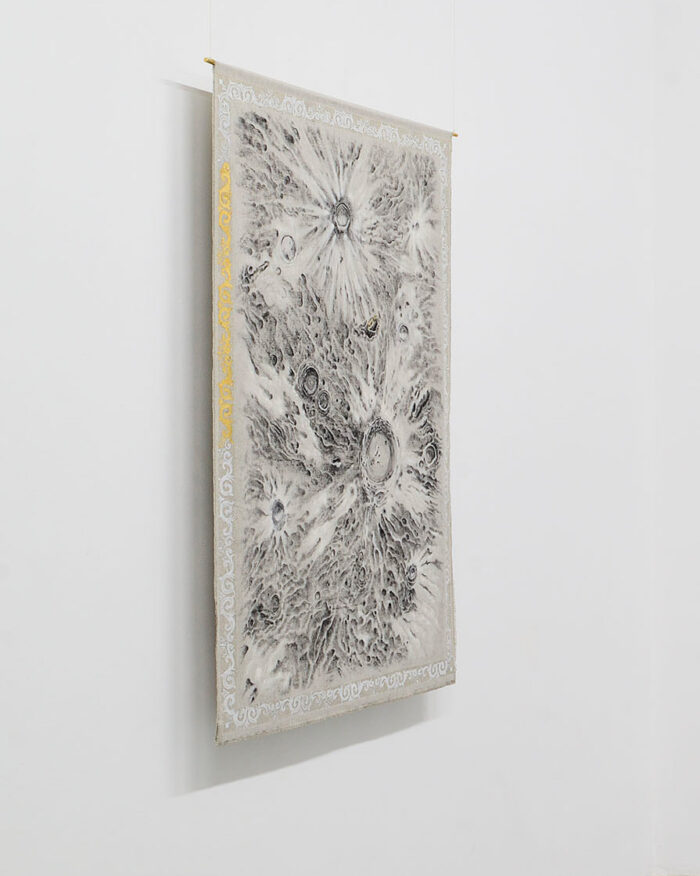 From another perspective, a latent sense of the present pressing toward the future seems to run through your work, particularly in relation to the renewed techno-optimistic imaginary of the new space age. In your works, however, we do not encounter rockets or the hyper-codified, artificially enhanced images of the cosmos disseminated today by space agencies on social media. Instead, your practice engages with historical, hand-drawn cartography, whose scale is determined by the reach and force of your own body—a more essentially human measure. What are your sources and aesthetic references?