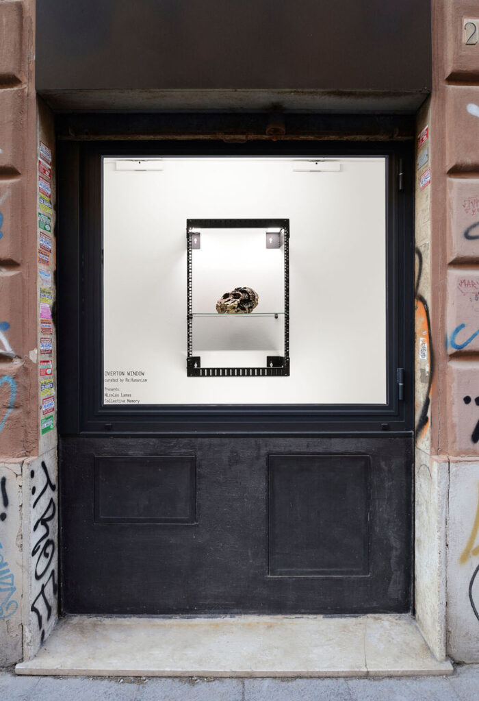 Collective Memory is an installation project born at the intersection of archaeology and the digital condition. Within a structure resembling a server—a symbol of contemporary data flows and invisible infrastructures—a bronze cast of a Kenyanthropus platyops skull and a wasp’s nest, a fragile trace of non-human collective intelligence, are fused together. In this hybrid form, different scales of time and modes of cognition collide: the “solid brain” as the stable architecture of living beings, and the “liquid brain” as the distributed, decentralised logic of insects and artificial systems. Nicolás Lamas’s work exists within this interval between the organic and the synthetic, the ancient and the digital, the individual and the collective. His installation transforms everyday fragments and historical artifacts into carriers of new meanings. Like an archaeologist of an imagined time, the artist investigates how memory, agency, and the very form of matter are reconfigured in the age of networked structures, inviting us to consider intelligence as a process that emerges within constantly evolving systems, biological and technological alike. This presentation of Collective Memory takes place as part of the fourth chapter of OVERTON WINDOW, a street-facing vitrine project presented by Matèria and curated by Re:humanism, which explores the intersection of art, technology, and contemporary digital culture. The series provides a context for engaging with emerging forms of artistic production and the evolving relationships between creative practice and digital infrastructures; it is within this framework that our conversation with Nicolás Lamas unfolds, offering insight into his approach, conceptual interests, and the questions that guide his work.