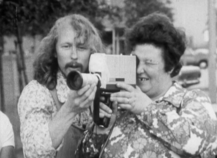 I’ll begin with a few words about the technologies that make images of cities, and the importance of technologies to what can be pictured about working-class suburbs, estates, slums, banlieus, ghettos… and I’ll do that with a scene I remember from a community video made as a participatory project, sort of, in the east end of London in the 1970s called Fly a Flag for Poplar (you can watch it here). Poplar then was a working-class area dominated by poorly paid factory work and dock labour, and Fly a Flag for Poplar recorded—and facilitated—a campaign for a local community centre. It celebrated the area’s history of community solidarity and radical working-class politics, and it also showed the making and screening of the film. And in those scenes you could see the filmmakers carrying huge battery packs and massive video cameras.