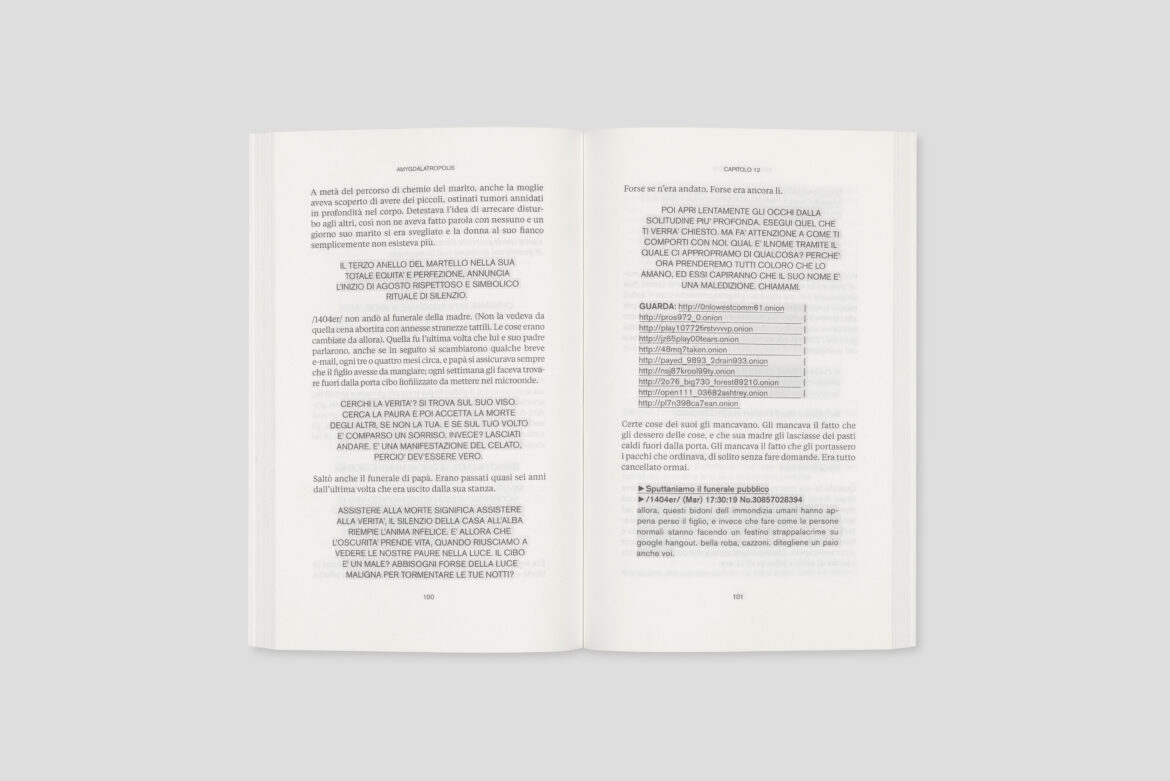 /1404er/, il protagonista di Amygdalatropolis, abita un mondo digitale ermetico popolato da altre entità senza forma che condividono con lui lo stesso nome. Le sue interazioni ruotano esclusivamente attorno alla condivisione e alla discussione (e a volte alla creazione) dei contenuti più volgari, violenti, ripugnanti e indifendibili che si trovano nelle zone d’ombra extra-legali del cosiddetto «dark web». Comunicando tramite una nube tossica di acronimi e gergo, la tribù dei /1404er/ condivide con cinismo e distacco glaciale le storie e le immagini più sconvolgenti. Nel frattempo, la «vita reale» si disintegra dietro la porta perennemente chiusa a chiave della cameretta.