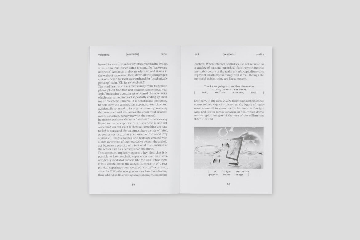 Exit Reality marks the first attempt to map a world imbued with disorienting hallucinatory qualities, a realm that appears as a parallel planet that has emerged from the depths of code-space. Starting from the advent of vaporwave, which infused the network’s native imagery with spectral qualities in the early 2010s, she takes us on a descent through the levels that traverse the silent horror of the Backrooms, brushes against the obsession with sensory stimulation of ASMR, delves into the algorithmic surrealism of weirdcore, and lands in the exploration of pseudomagical practices such as reality shifting and memetic rituals. All the while, we remain comfortably seated before our screen, inside a battlestation ready to take off for a one-way astral journey, eternally trapped in the liminal space born from the now inseparable bond between human visions and Machine dreams.