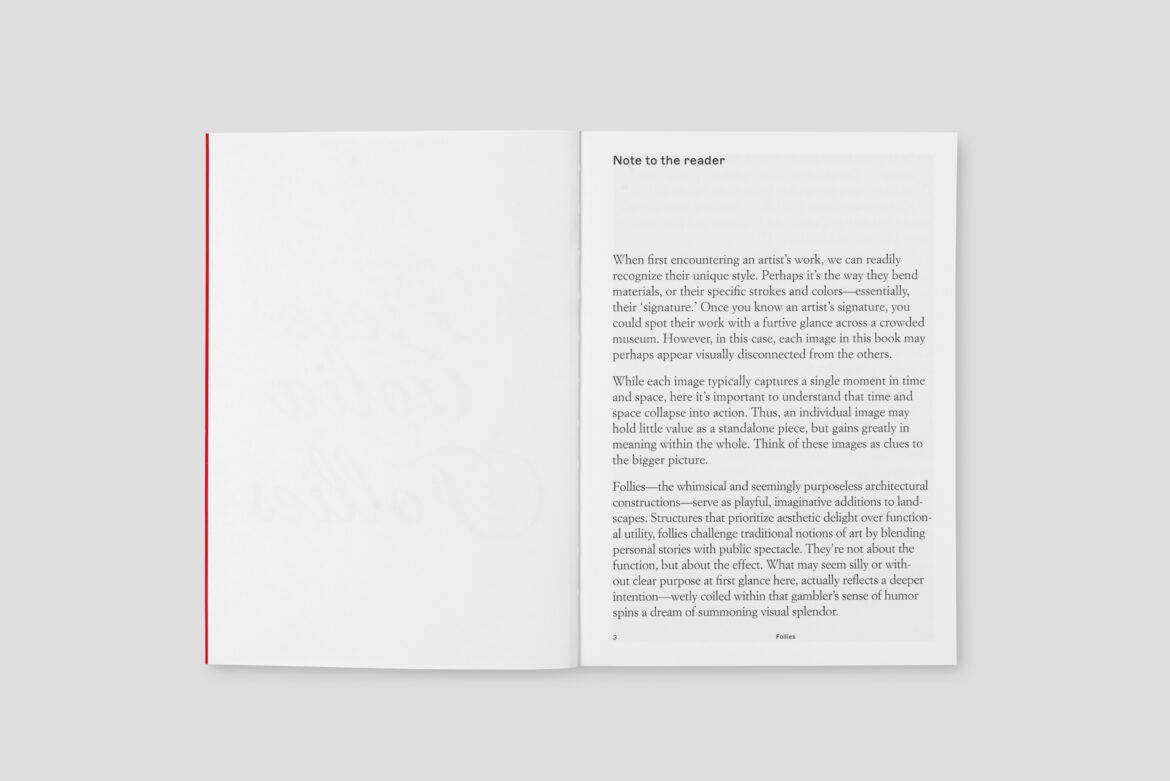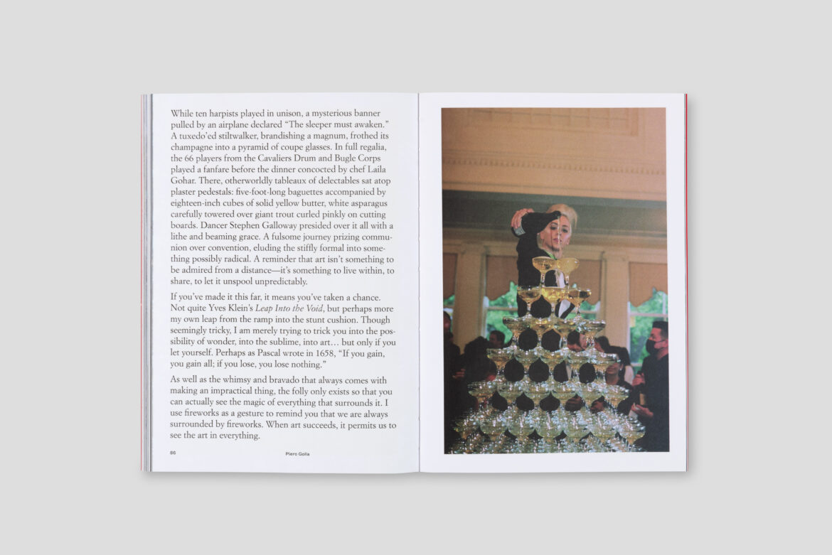 For Piero Golia, art is a magical medium—a means to conjure unpredictable experiences of collective engagement and playful interaction. Follies is an artist’s book of images and words—an exploration of Golia’s imagery and an articulation of his personal understanding of art.