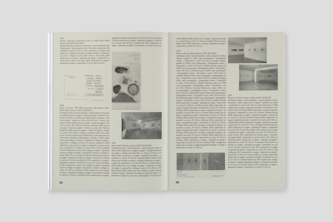 Published in English, French, and Italian, the extensive conversation is punctuated by a generous gallery of images accompanying the journey through his work and his multifaceted biography, followed by installation views of the exhibition in Geneva—which also bridges Colombo’s past and present practice. The book is completed by a detailed chronology compiled by Sara De Chiara, also rich in images and documents, which traces his experience as an artist.
