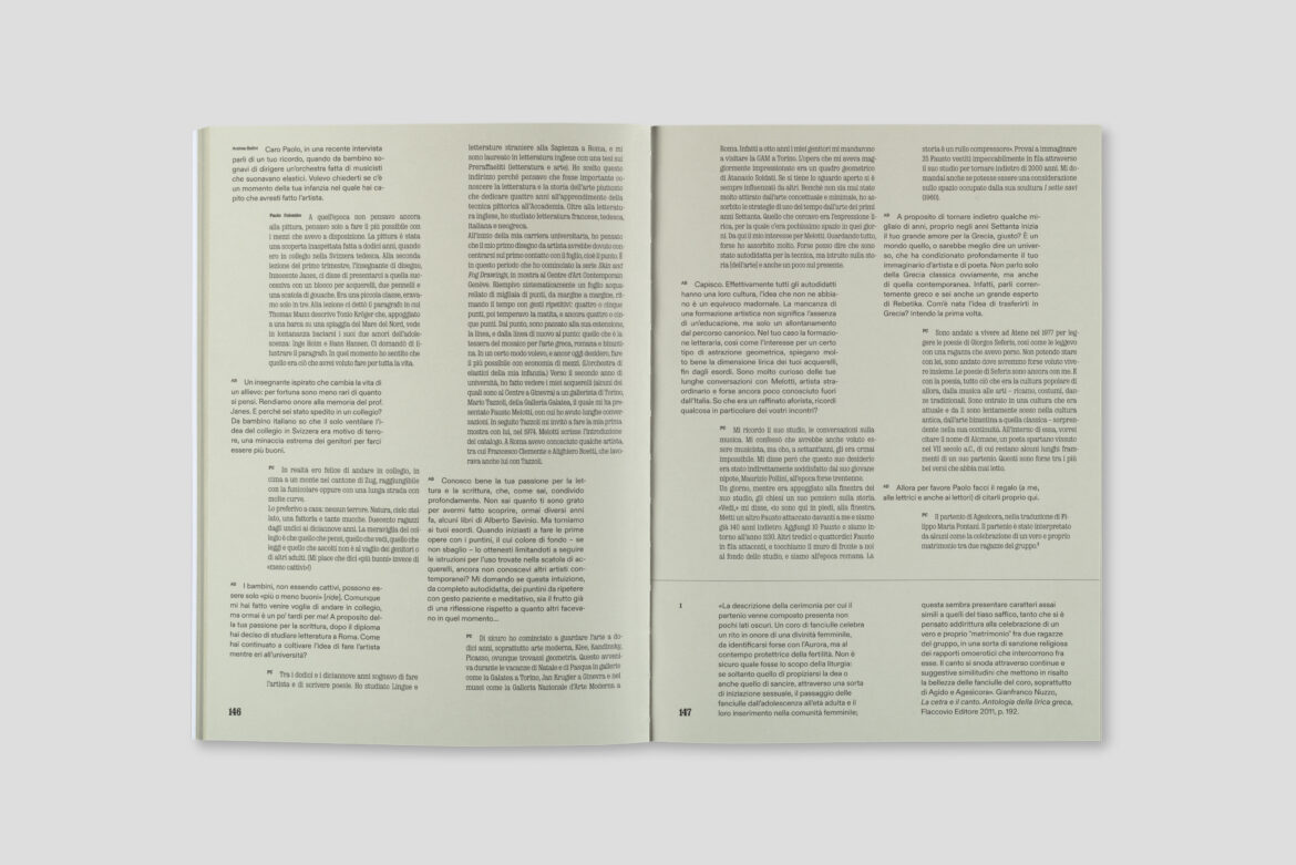 The conversation unfolds between these two facets of Colombo’s professional life, but also offers insights into his passion for literature and poetry—he is himself the author of verses that appear in many works—for Greek culture, from classical to modern, for rebetika musicians, as well as for the artists who have inspired his work, such as Fausto Melotti and Alighiero Boetti.