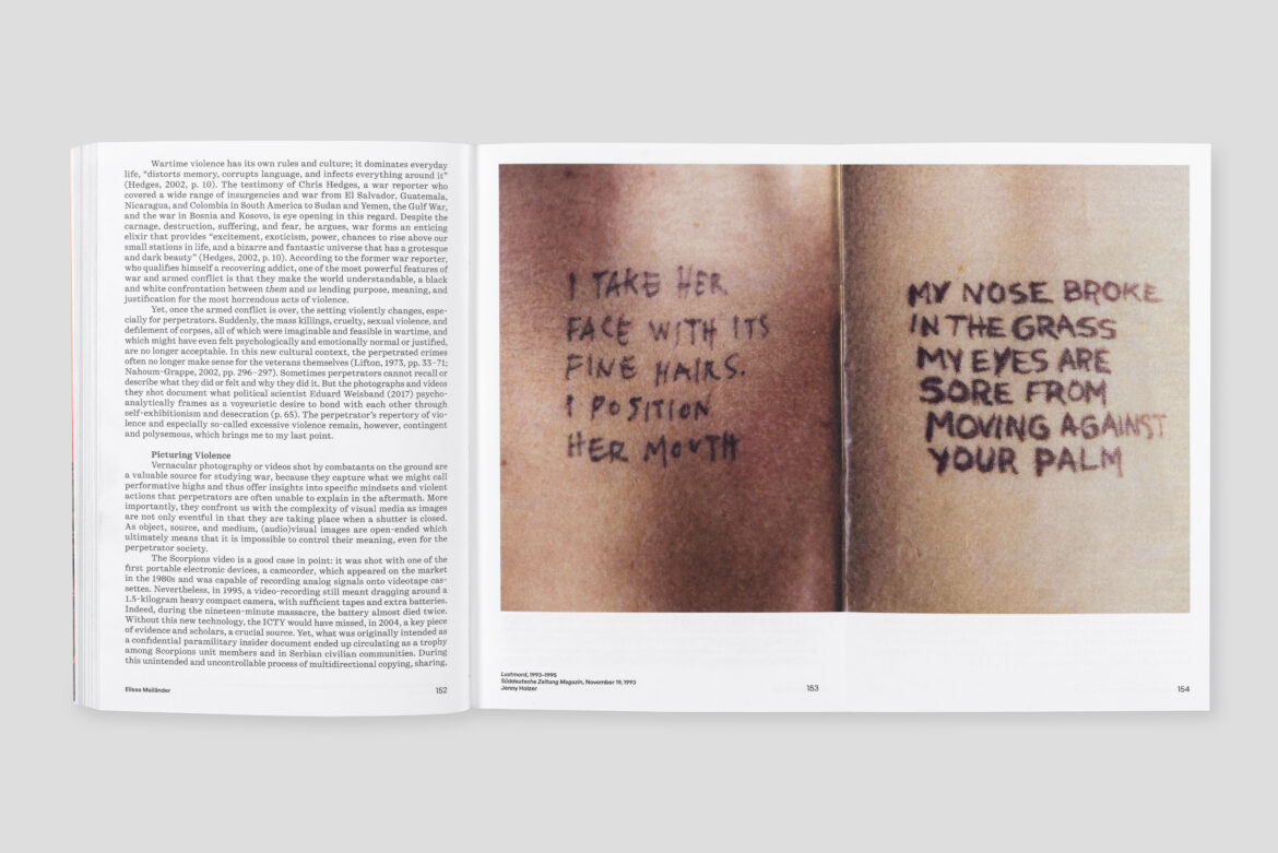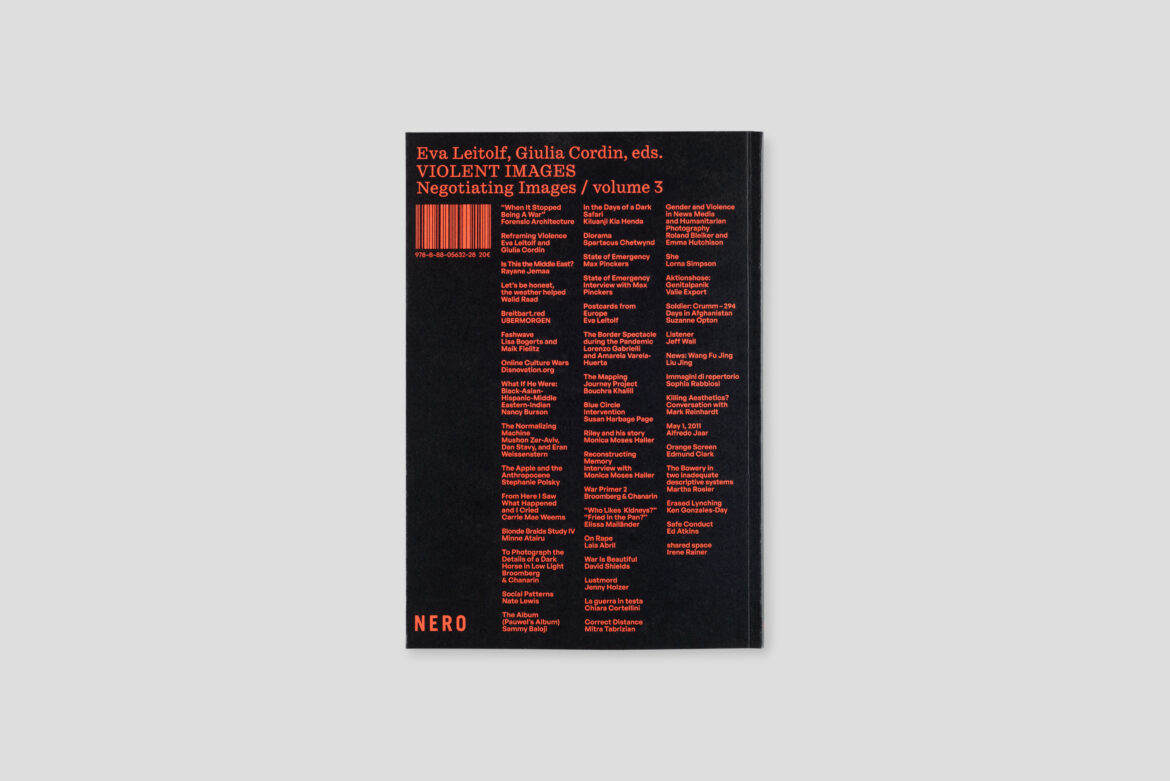Violent Images is the third volume in the Negotiating Images series, edited by Eva Leitolf and Giulia Cordin. The previous volumes are Shoot & Think (unibz) and Landscape with(out) Locus (NERO Editions).