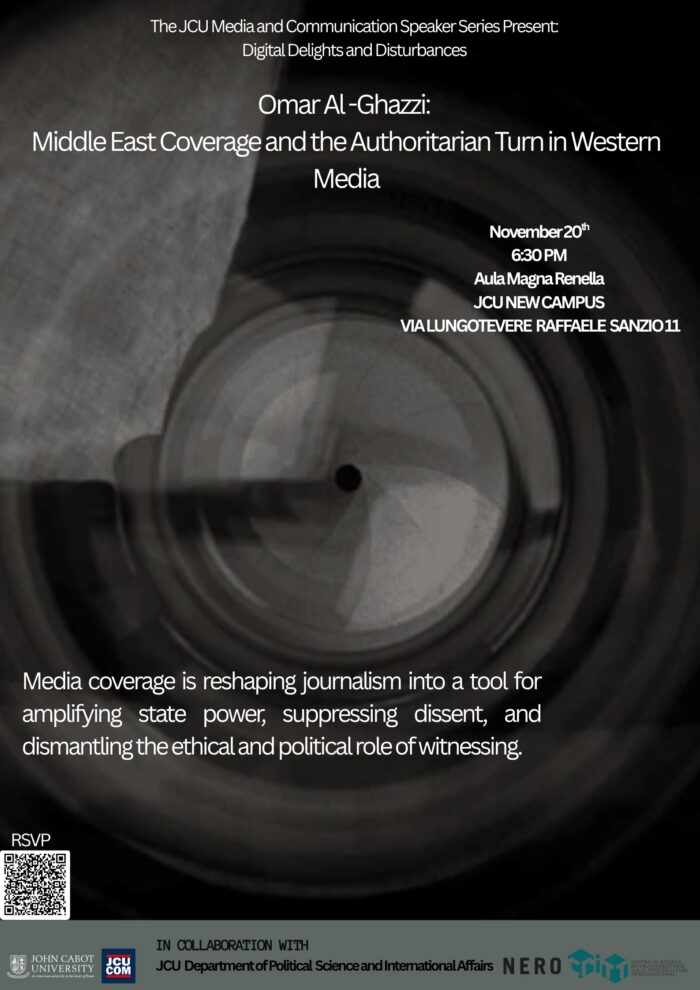Join us for this Fall fourth and final talk of the Digital Delights & Disturbances series on Thursday, November 20 at 6:30pm in Aula Magna Renella, New Campus organized and supported by the Department of Communication and Media Studies at John Cabot University, offered in collaboration with the Department of Political Science and International Affairs.