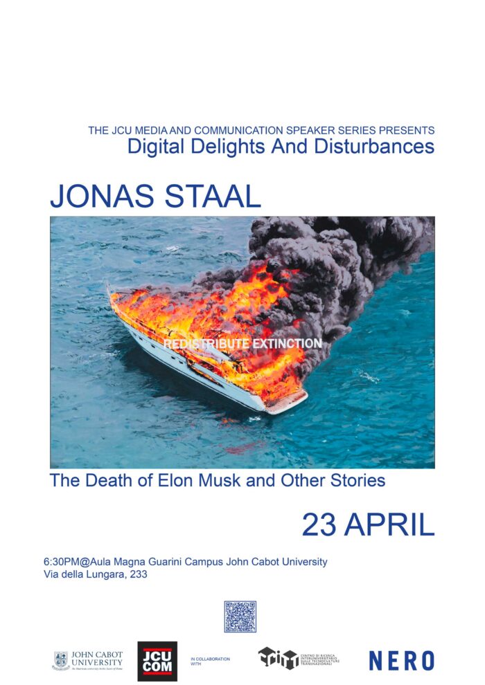 On April 23rd, at 6:30pm, at John Cabot University Guarini Campus, in Via della Lungara 233 (Rome), the Department of Communication and Media Studies at JCU will host The Death of Elon Musk and Other Stories, a talk by Jonas Staal, as part of the Spring 2026 edition of the event series Digital Delights & Disturbances (DDD).