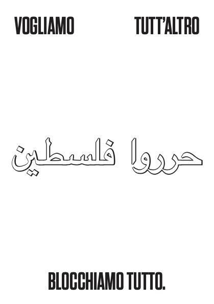 There were many slogans and banners in this strike against the genocide in Gaza and against fascist repression in Italy. I would like to highlight one in particular: that of the national platform of art, culture and entertainment workers, created in response to the cuts that the Meloni government has imposed on public funding for independent arts: “VOGLIAMO TUTT’ALTRO” — WE WANT EVERYTHING ELSE, that is we want something completely different.