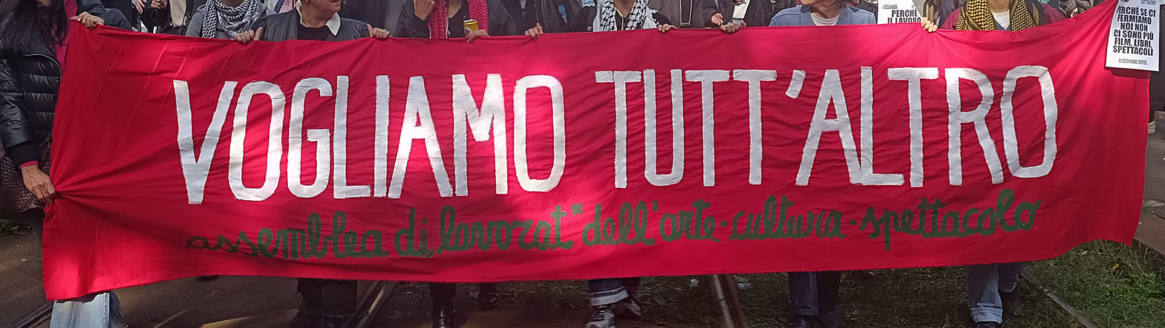 There were many slogans and banners in this strike against the genocide in Gaza and against fascist repression in Italy. I would like to highlight one in particular: that of the national platform of art, culture and entertainment workers, created in response to the cuts that the Meloni government has imposed on public funding for independent arts: “VOGLIAMO TUTT’ALTRO” — WE WANT EVERYTHING ELSE, that is we want something completely different.