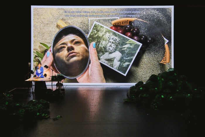 In this surreal environment, the performer (Anna Pérez Moya) gathers together bits of stories, never reaching the end of any: myths from ancient Greece intermingle with pop icons and with biographical snippets (though whose biography remains a mystery).